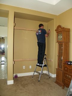 In our master bedroom we have these alcoves that are a waste of space. So on one side we did shelves for food storage and then put doors over to cover it. On the other side we did a craft area for all of my craft stuff with a desk to sew, scrapbook or whatever. It turned out so great and I am going to add more stuff a little later.